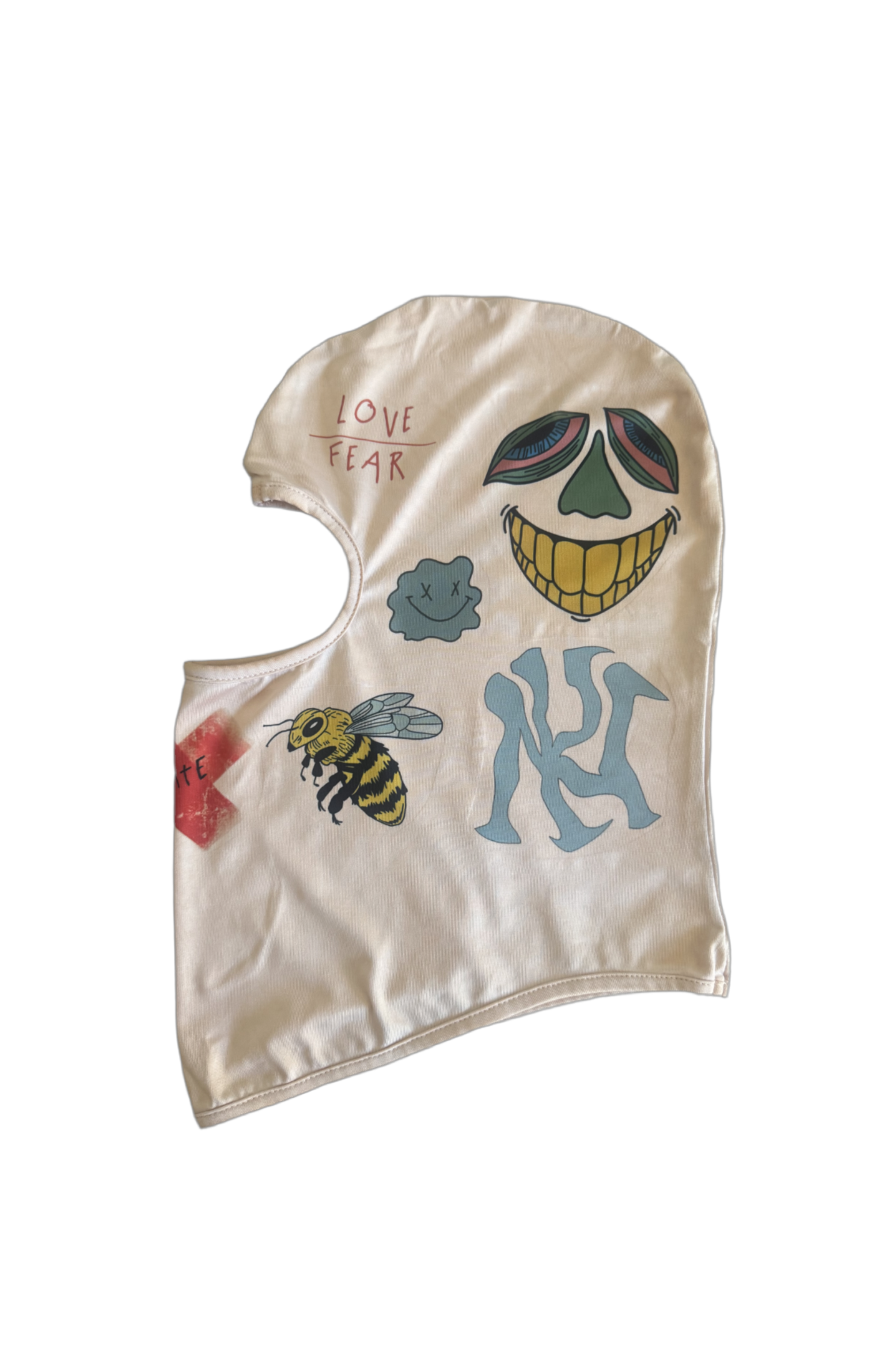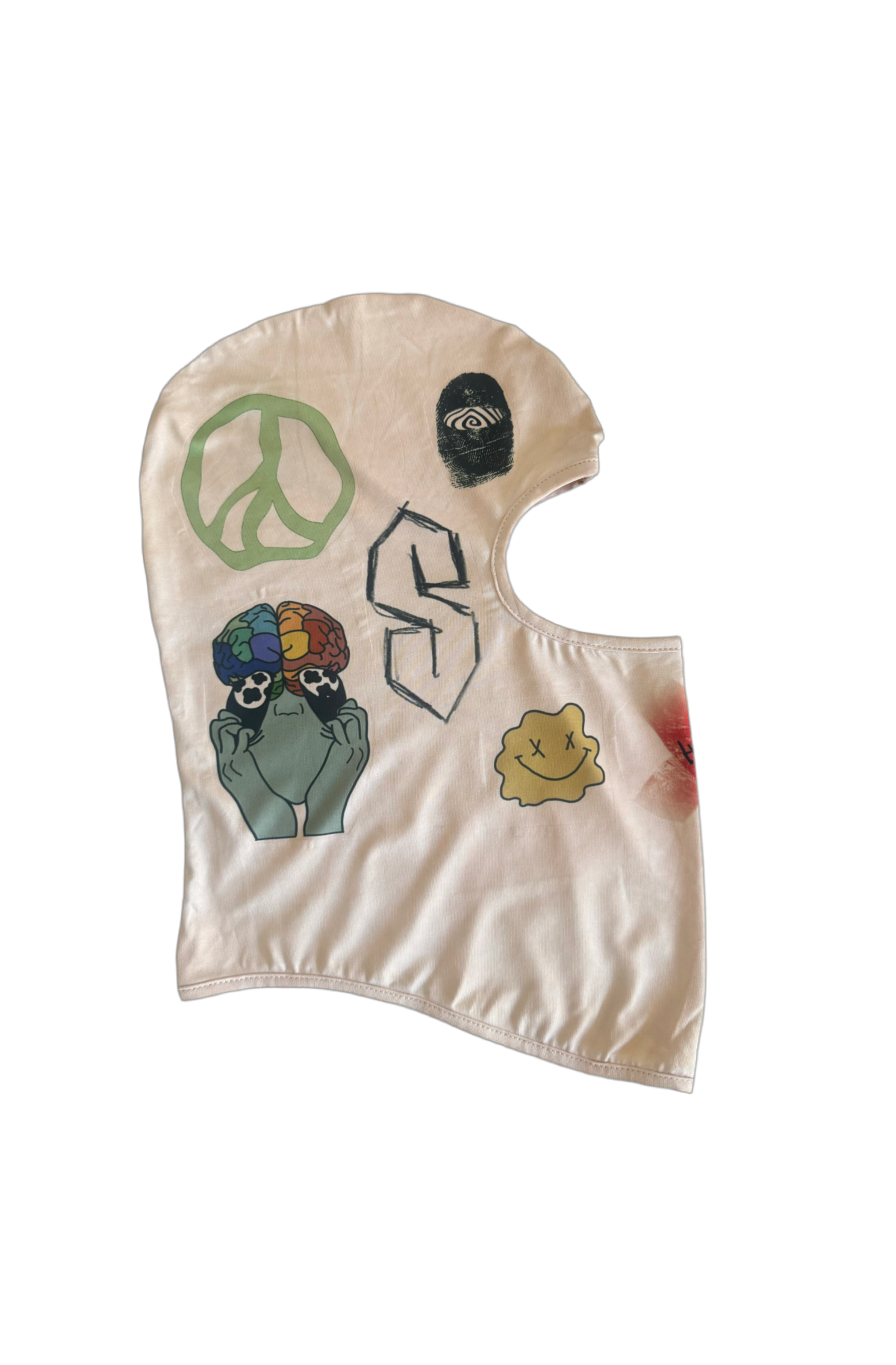 Hand dyed to a Pale Orange with drawings sublimated to mask, creating sticker-bomb look. Ski mask is a soft lightweight, durable elastic. Comfortable and quick drying, making it excellent for outdoor and sport activities. (PLEASE NO STICK UPS AT YOUR LOCAL CORNER STORES 😅)