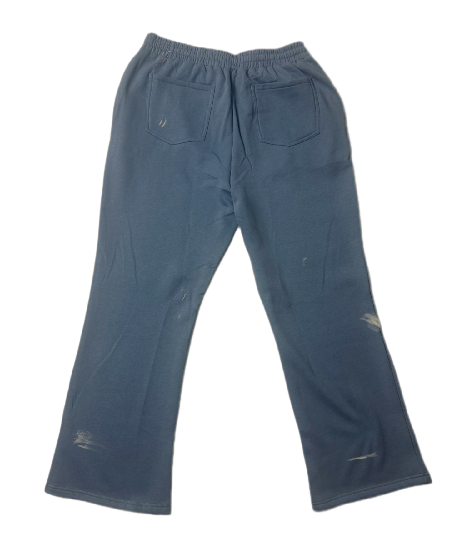 Clear Sky Blue flare-cut sweatpants, has a Tan-Stone color font, with light splotches of ink. Made with a cotton/polyester blend material, for a baggy soft stretchy feel. Sweats have front deep pockets with 2 back pockets, and has pull tie strings to give you a customizable good comfort experience.