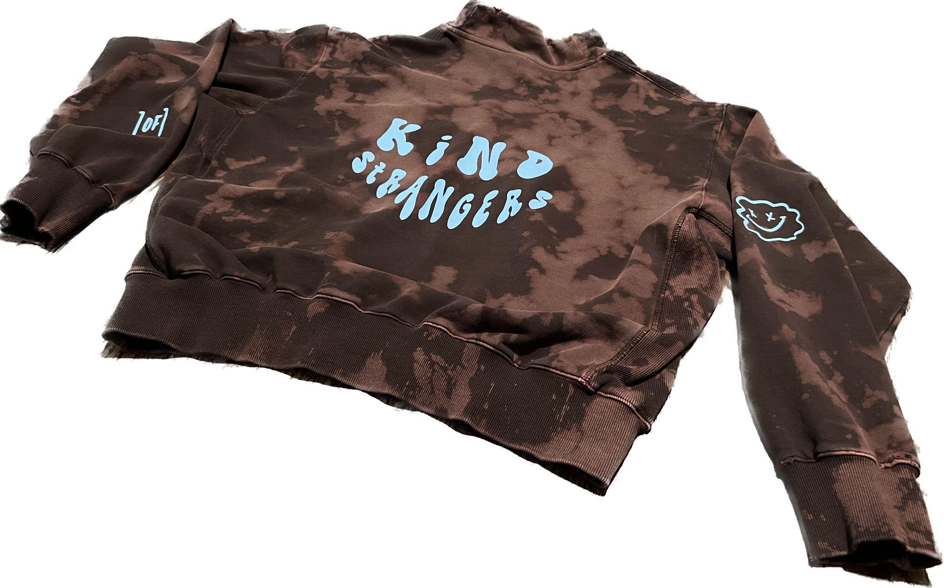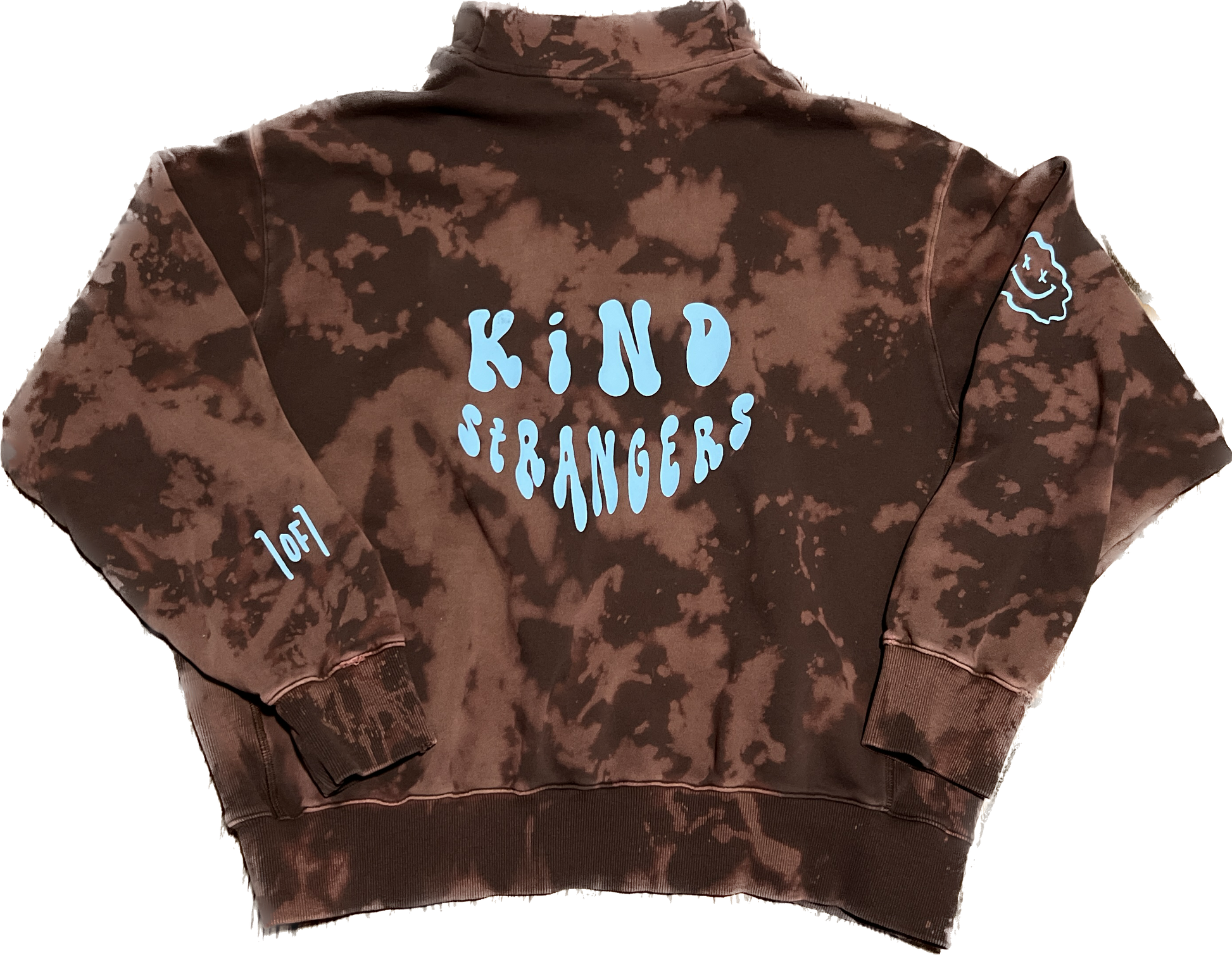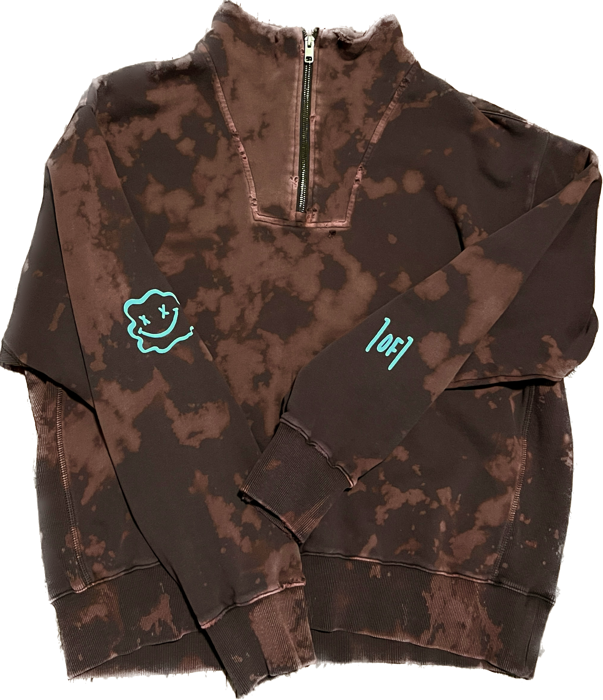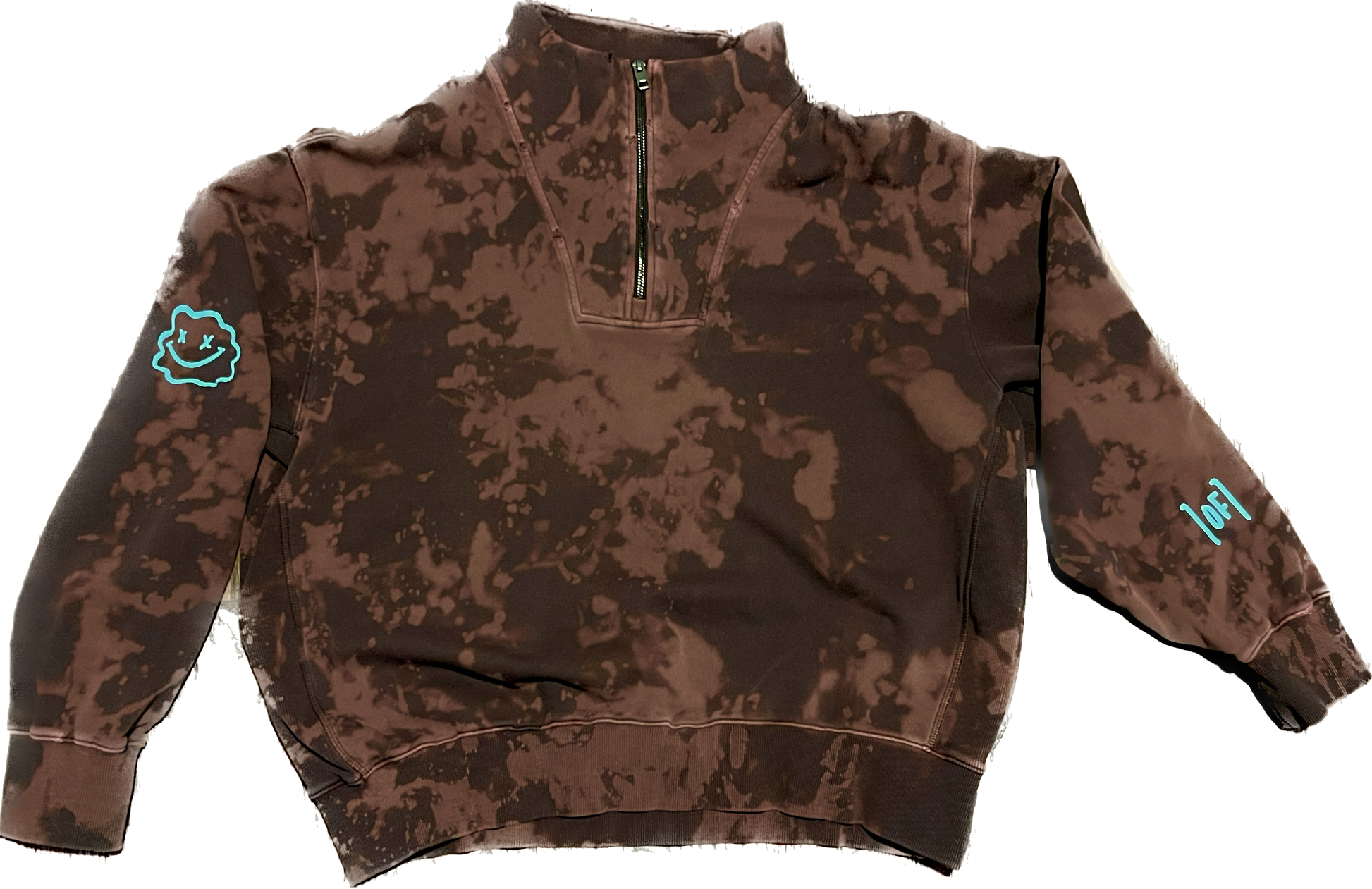 Quarter Zip up jacket, each a 1 of 1 of brown tones with ice blue ink, oversized cotton material with tasteful hits of distress.