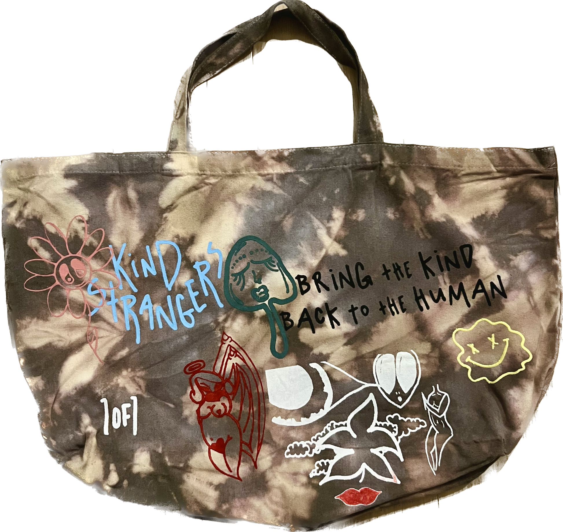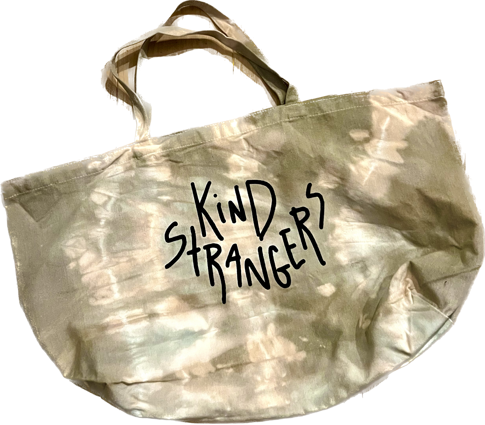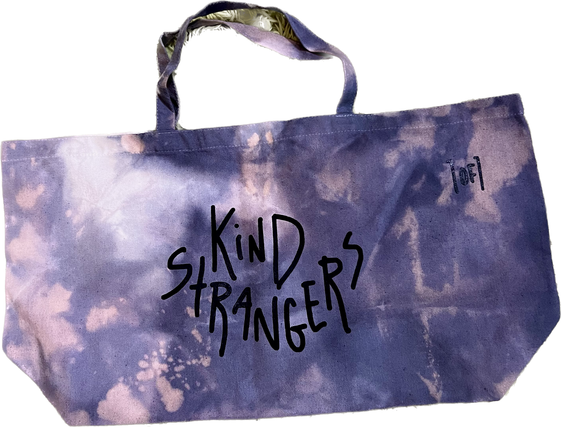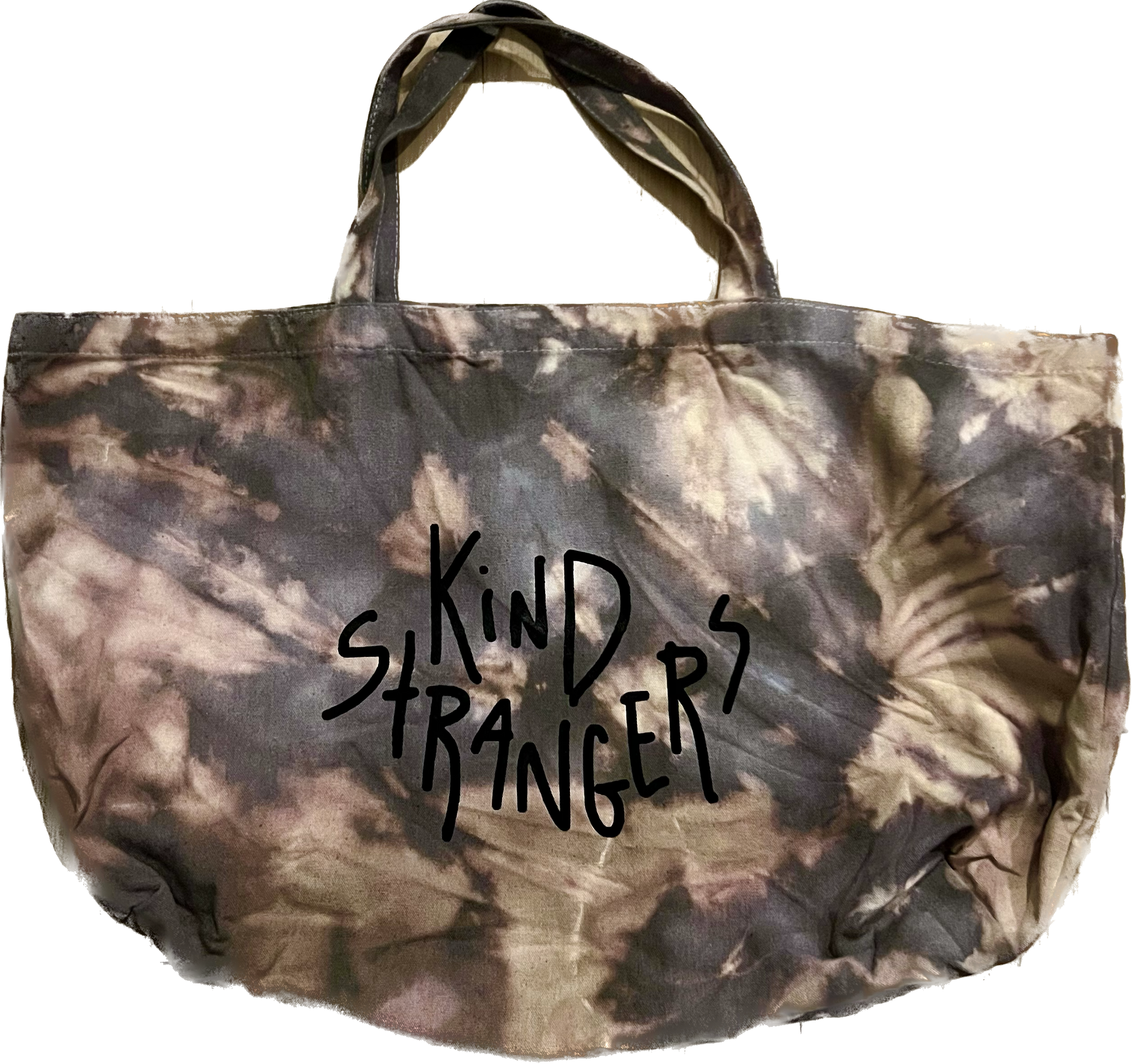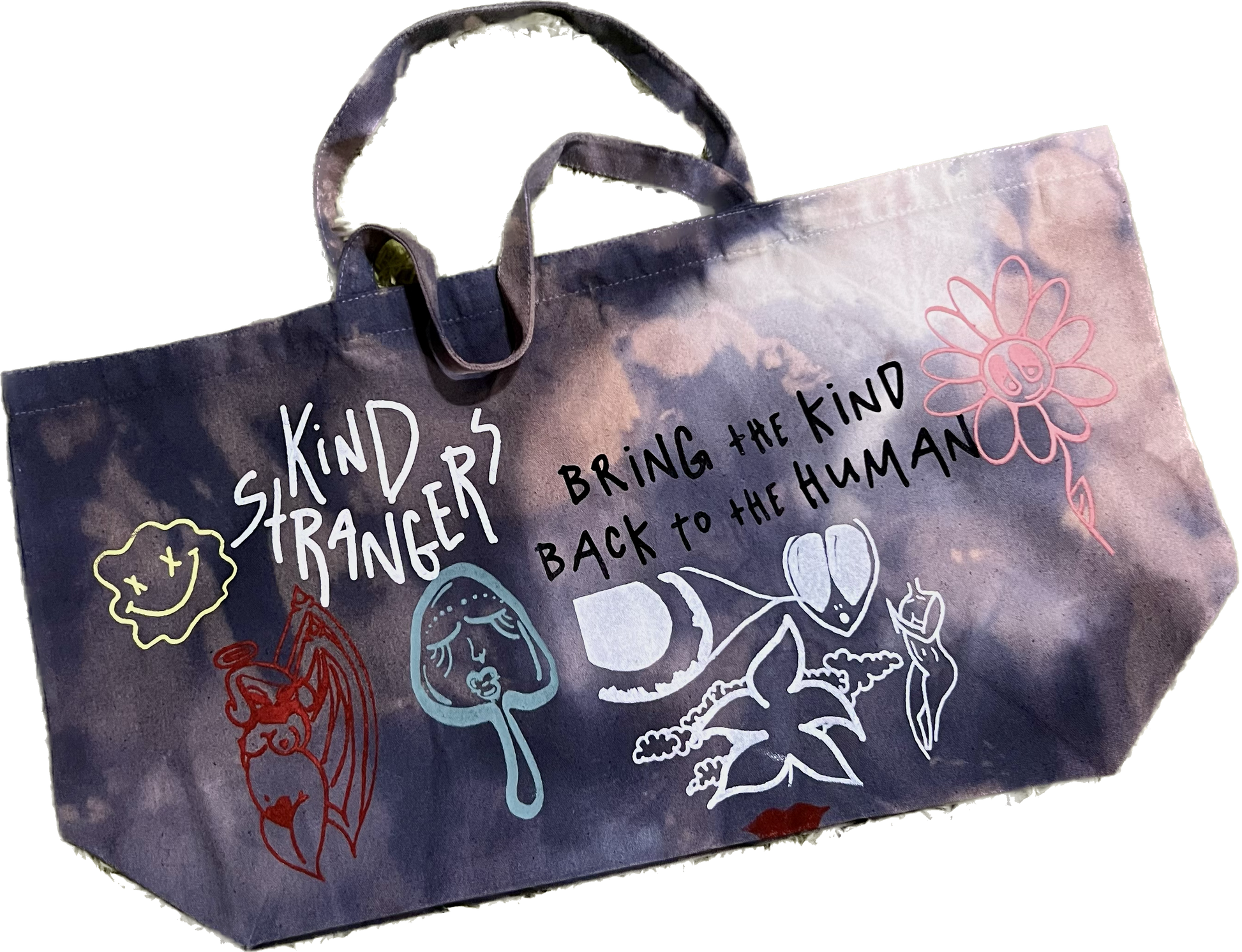 Open Top Extra Large Tote Bag. Made to store many various items. The Jumbo Tote features a doodle style all over print on one side and the bold Kind Strangers stamp on the lateral side. Reinforced long handles and a deep inner pocket make this bag perfect for shopping and comfortable storing. Hand-dyed/Tie Dyed and one of one.