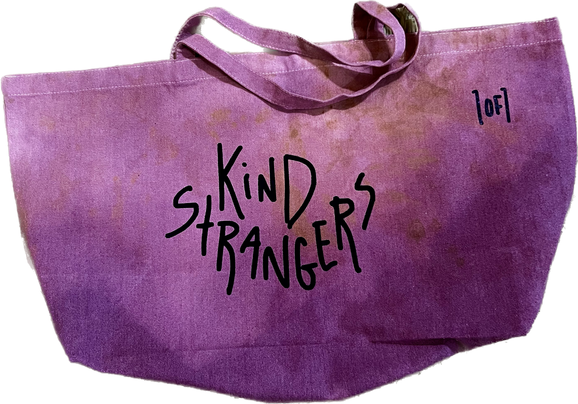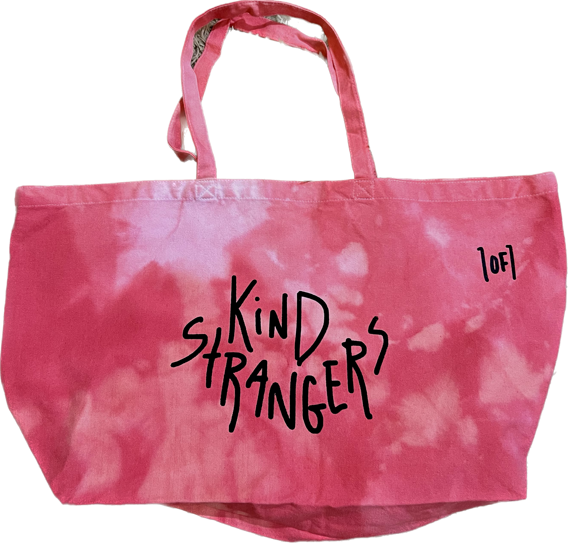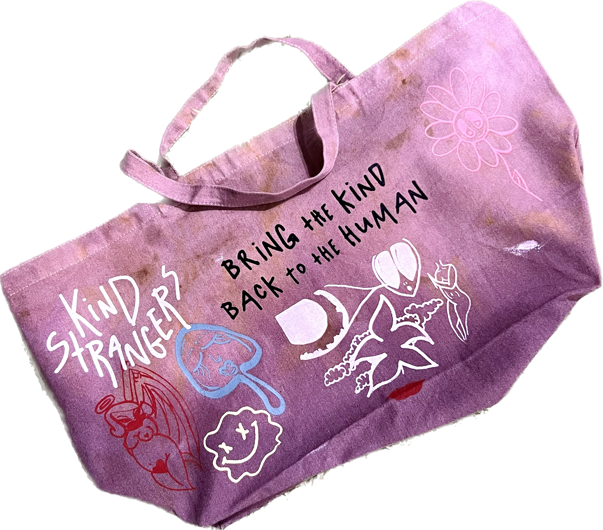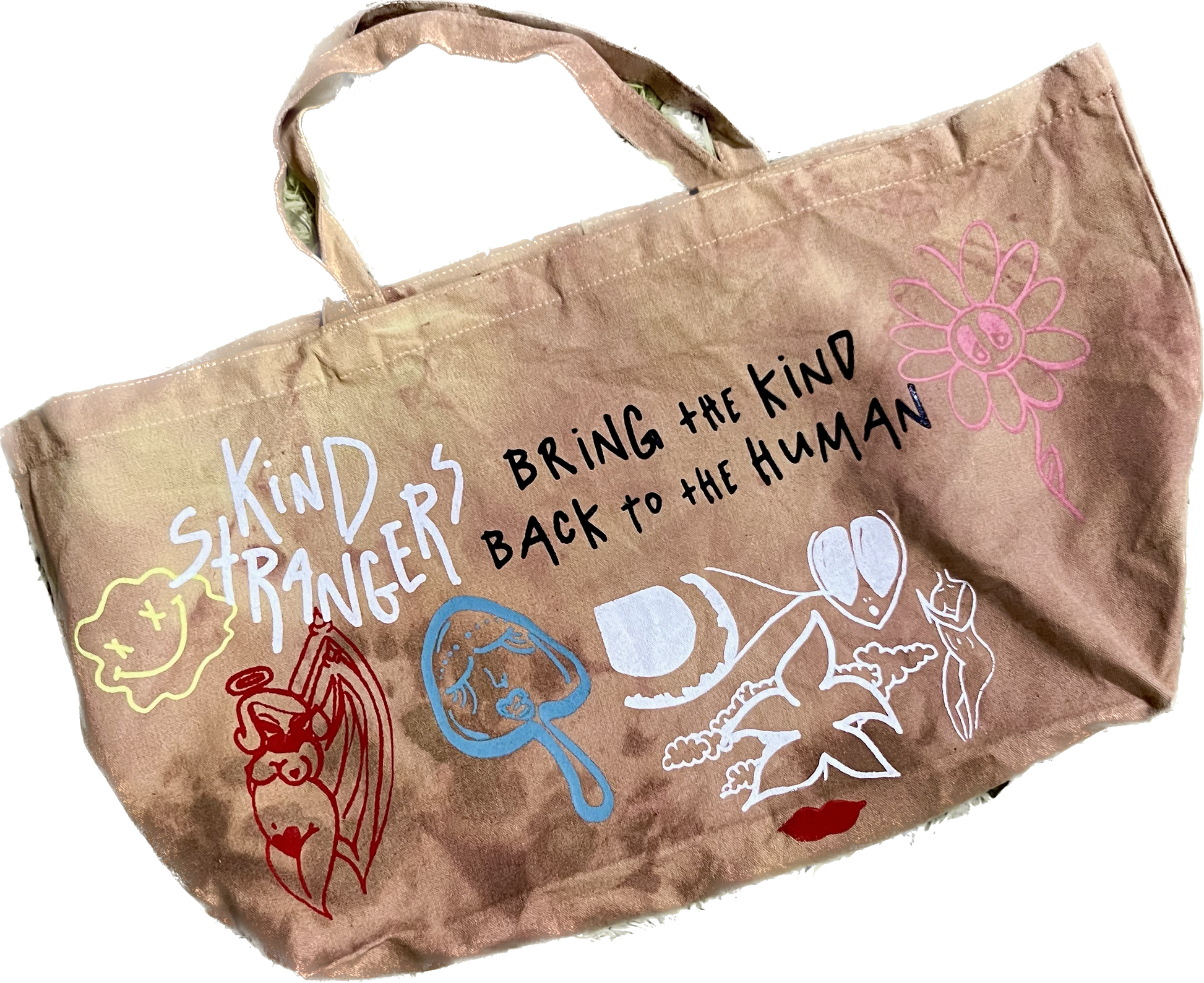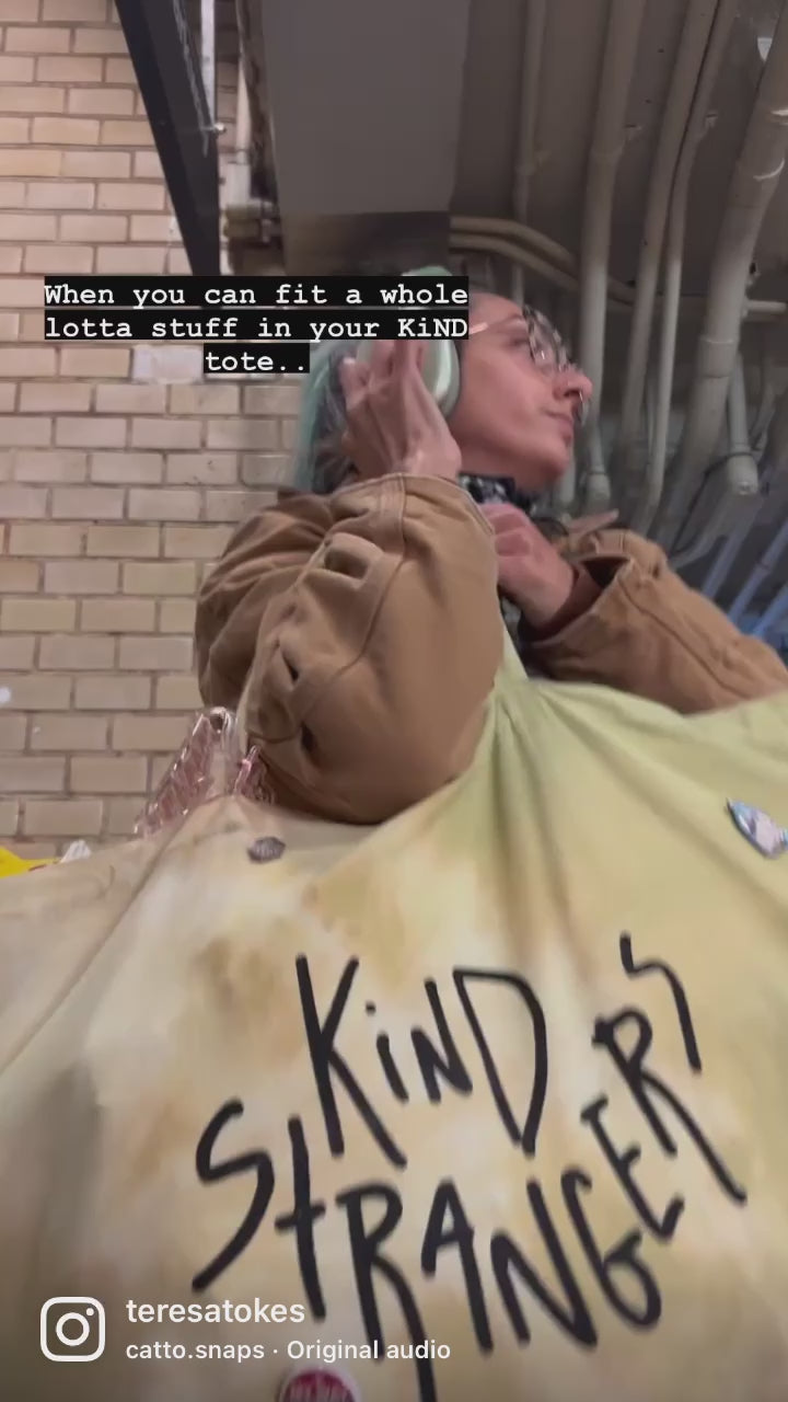 Open Top Extra Large Tote Bag. Made to store many various items. The Jumbo Tote features a doodle style all over print on one side and the bold Kind Strangers stamp on the lateral side. Reinforced long handles and a deep inner pocket make this bag perfect for shopping and comfortable storing. Hand-dyed/Tie Dyed and one of one.