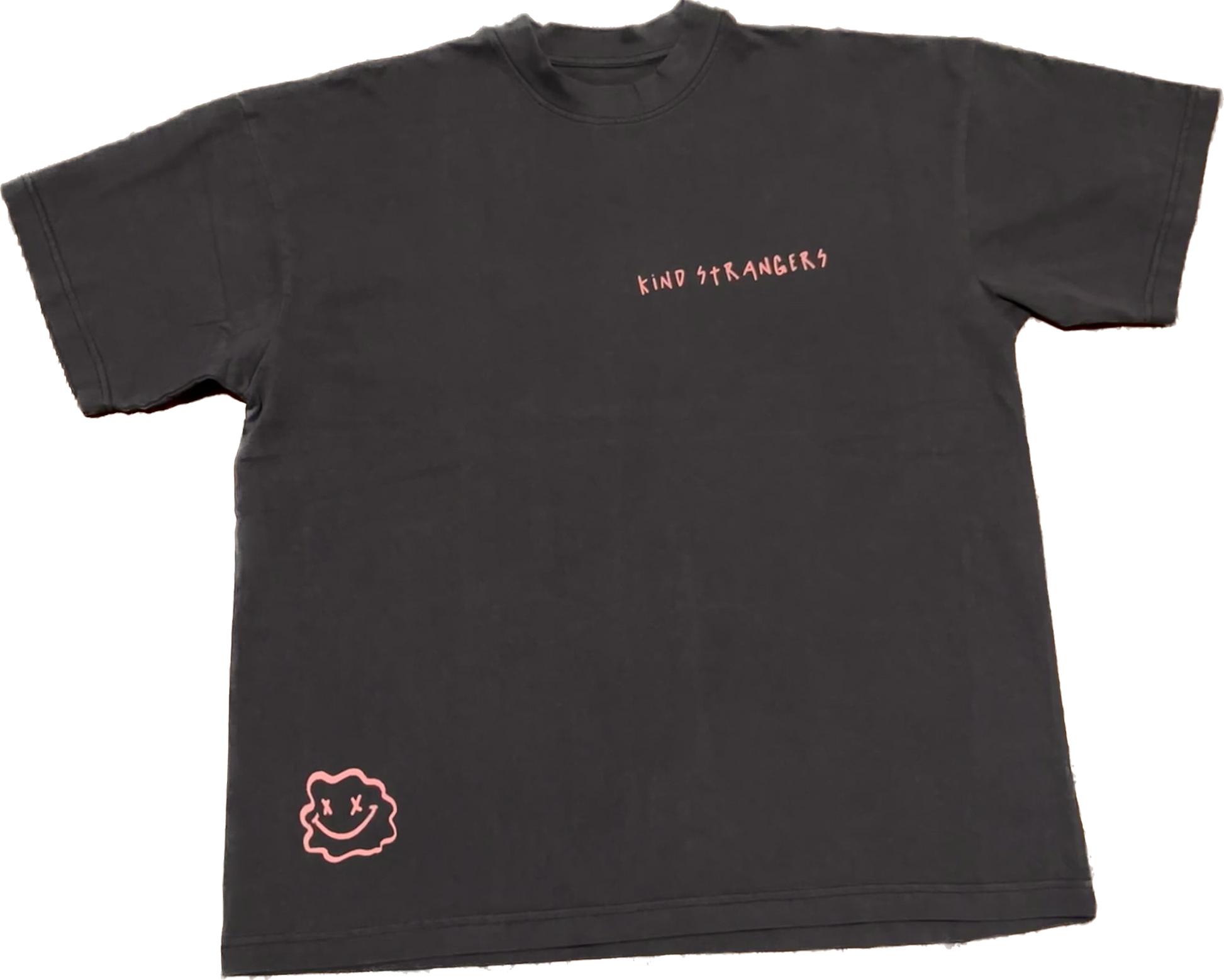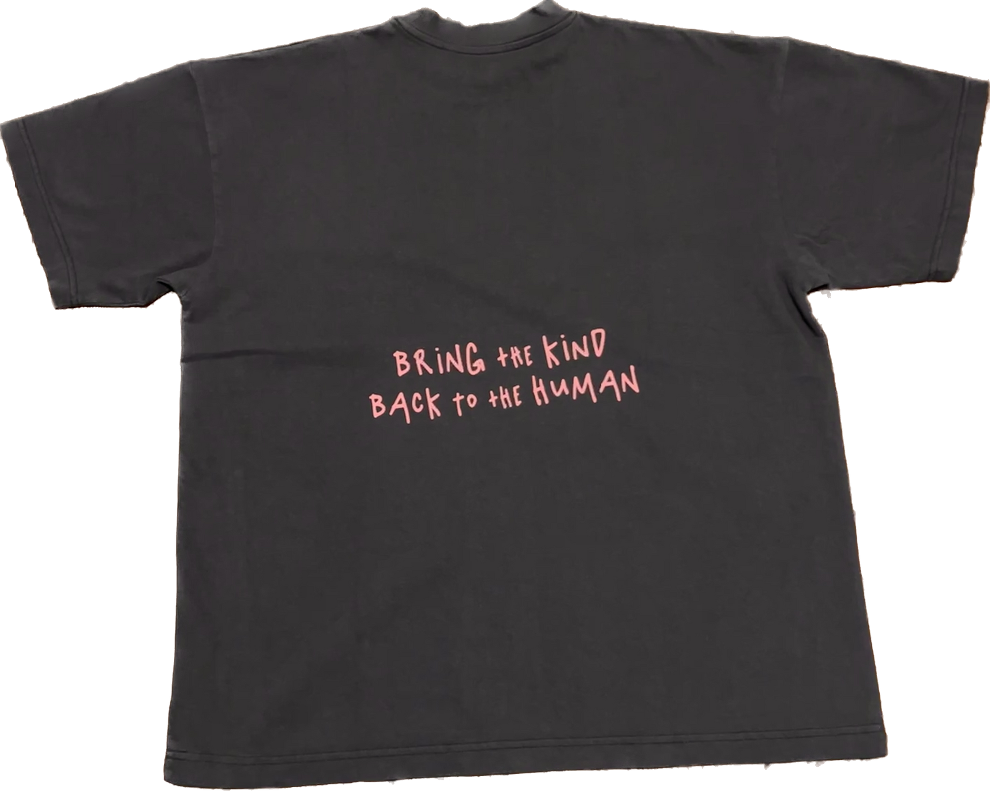 Soft cotton vintage black tee, made to fade. Small chest piece KiND StRANGERS with ‘Bring the kind back to the human’ on the back, as a reminder to those walking behind you.