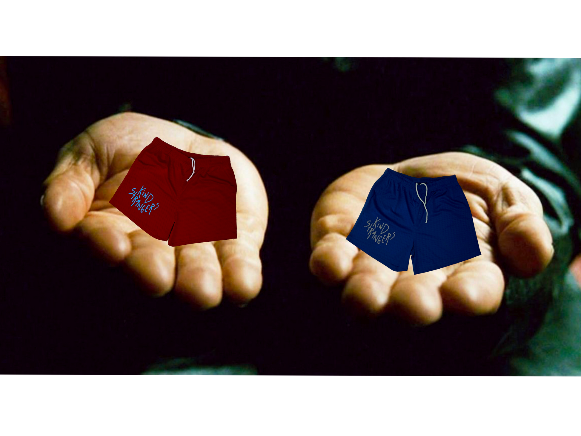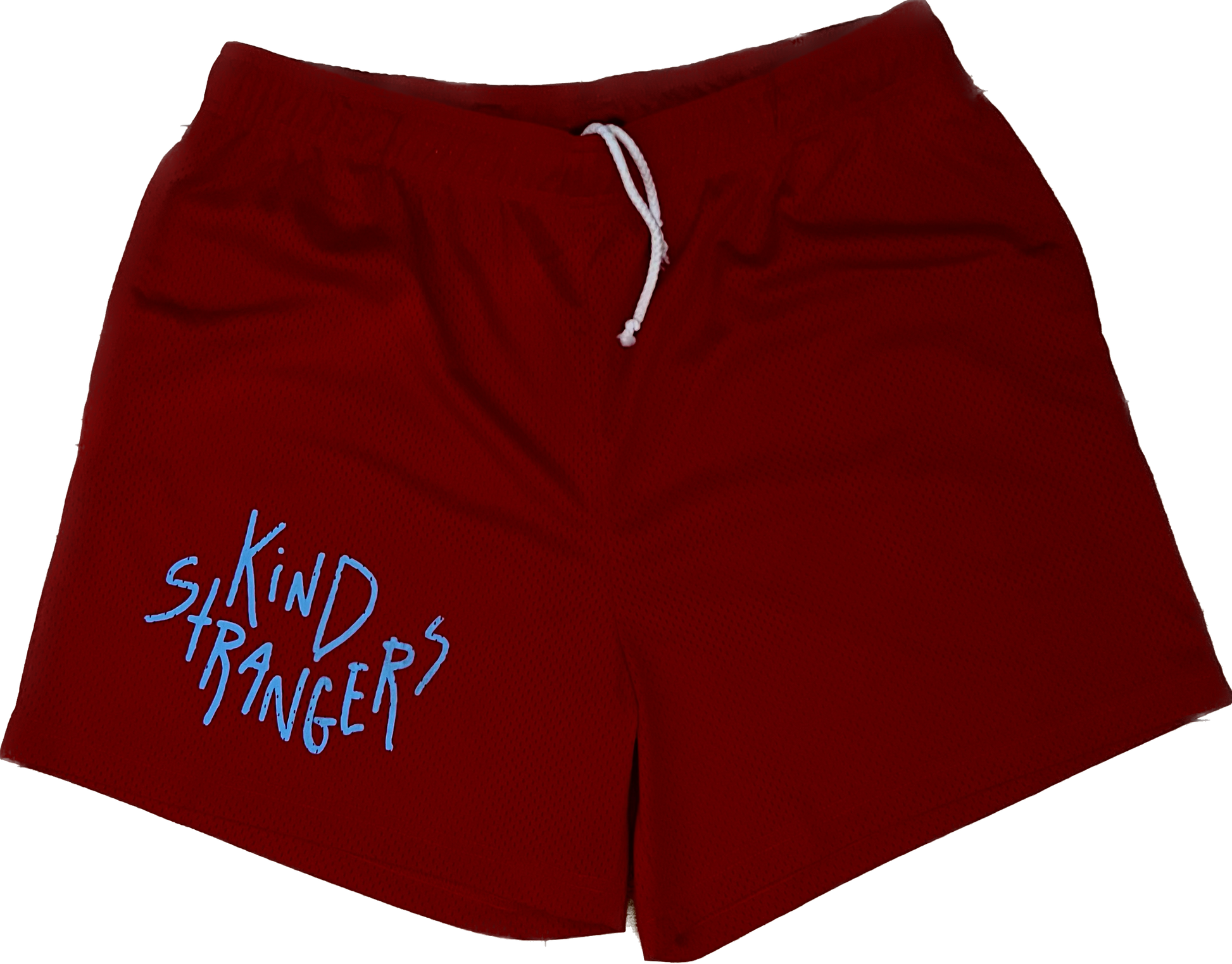 Two front deep pockets. Stay true to size for above-the-knee fit. The “True Red” mesh short features a “Ice blue” Kind Strangers stamp on the lower right leg.